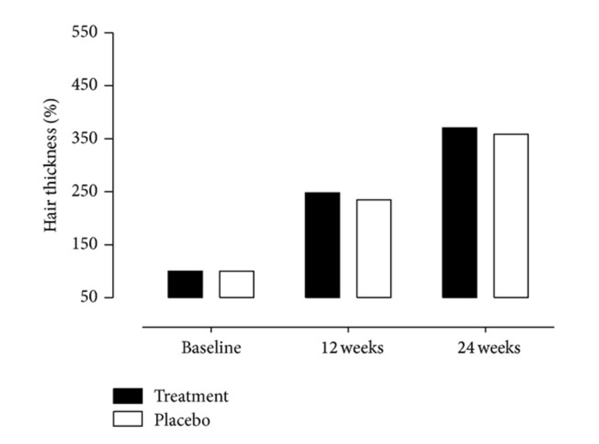 Now look at measures of hair thickness. Placebo and treated are the same after 24 weeks, and both changed by over 300% in just 24 weeks. Wow! Take a placebo and increase hair thickness by 3X. Let’s all take placebos. Obviously, these data are bogus.