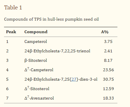 Pumpkin seed oil contains many phytosterols as shown in Table 1 (from Kang et al, 2021). These phytosterol compounds have anti-inflammatory effects. β-Sitosterol, for example, is a well known anti-inflammatory.