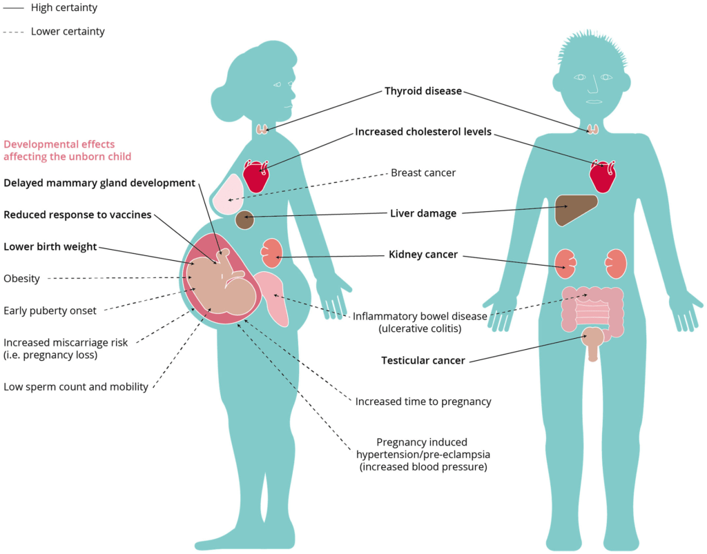 PFAS, a long lasting chemical found in many sunscreens has been banned in cosmetics by California (first in nation). PFAS do not naturally exit the body for many months or many years and are not known to degrade in the environment, they are considered “forever chemicals.” Widespread human exposure to PFAS in water, food, and air coupled with the lengthy environmental persistence and biological half-lives of months to years for some PFAS have led to measurable PFAS in the blood of nearly the entire population in developed countries, with health effects reported globally. While much work has provided evidence that these PFAS chemicals are damaging, more studies are required to better understand what can be done to mitigate their effects, especially given they remain in our environment for decades. Therefore, it’s imperative to reduce the amount of PFAS you are exposed to by food, water, and topical care products. Some of the damaging effects on the human body are illustrated in Figure 1. Be aware that the damaging effects may be more severe in children given their brain, immune system, and other organs are developing in a rapid manner where toxic chemicals may interfere with developmental signaling molecules in the child’s organs.