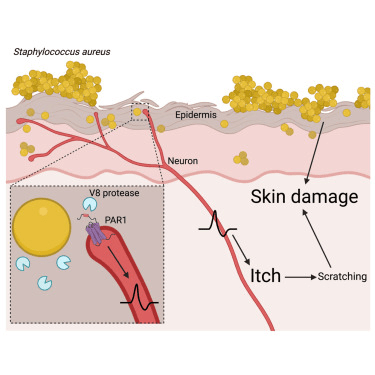 The skin barrier in the epidermis is constantly exposed to microbes and their products. The role of microbes in itch generation was previously unstudied. Deng et al (2023) find that Staphylococcus aureus, a bacterial pathogen associated with itchy skin diseases, directly activates pruriceptor sensory neurons to drive itch.