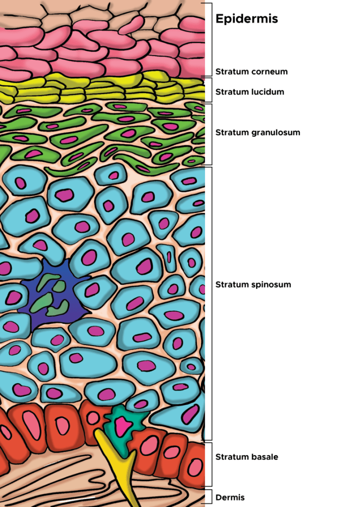 As the outermost layer of the epidermis, the stratum corneum is the first line of defense for the body, serving an essential role as a protective skin barrier against the external environment. The stratum corneum aids in hydration and water retention, which prevents skin cracking, and is made up of corneocytes, which are anucleated keratinocytes that have reached the final stage of keratinocyte differentiation(From Murphrey et al, 2022).